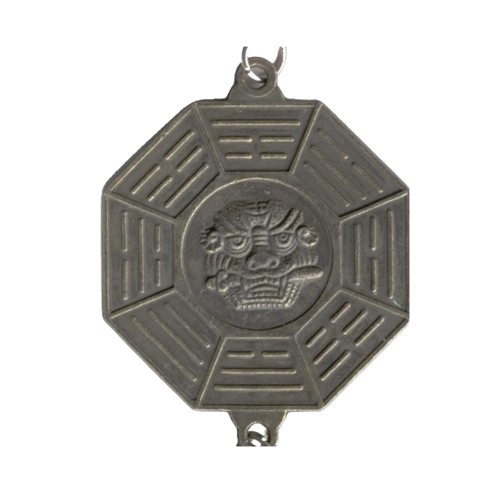 This tassel is shown on one side with 12 Chinese zodiac sign animals surrounding a round mirror. On the other side it has eight trigrams marked around a tigers head. It's tied with a mystic knot, in addition a plaque.