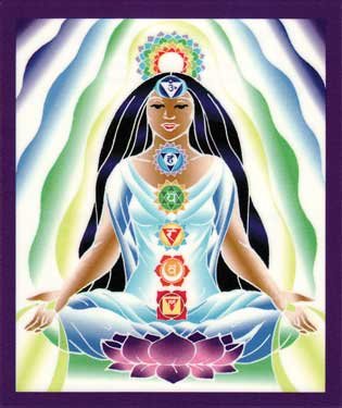 A peaceful Goddess sits in meditation, with mandalas for each chakra in rainbow colors. 3.5" x 4" Printed on both sides.
