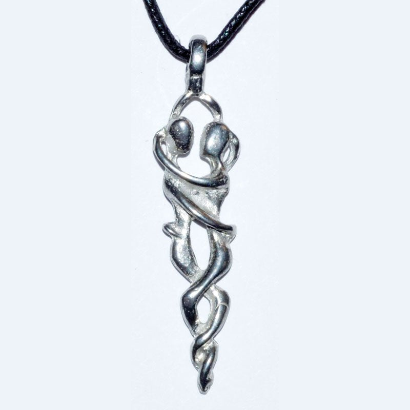 Formed in the shape of two lovers holding each other, this lead-free pewter amulet is intended to evoke the power and vision possessed by lovers alone.
