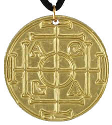 Made out of lead free pewter with a gold tone finish, this double sided amulet measures 1 3/8" in diameter and comes with an included black satin cord to wear it on.