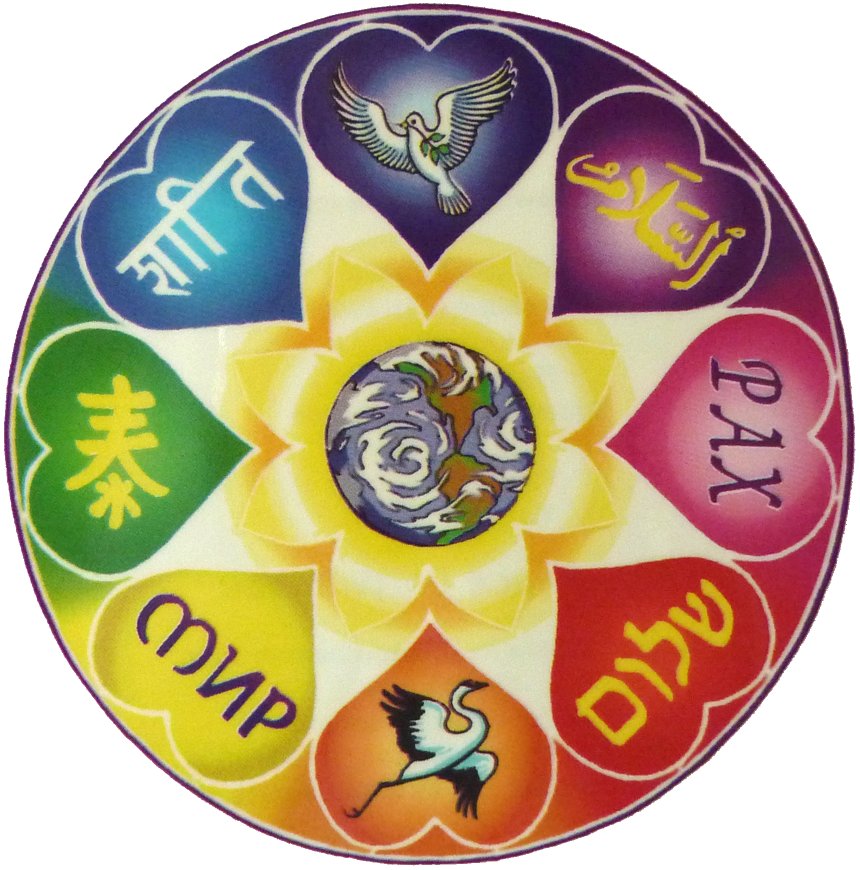 Words and images for peace, inside a rainbow of hearts, in a beautiful mandala. 4" round; Printed on both sides.