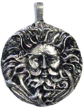 This detailed pendant portrays an expressive image of the Greenman, a figure celebrated as the Celtic god of the wooded green forest. Portrayed with leafy hair and verdant green beard, he is often revered as a figure of renewal and rebirth. This pendant, made of pewter, measures approximately 1 1/4" in diameter and has a large bail to allow you to fit it to your favourite cord or chain.